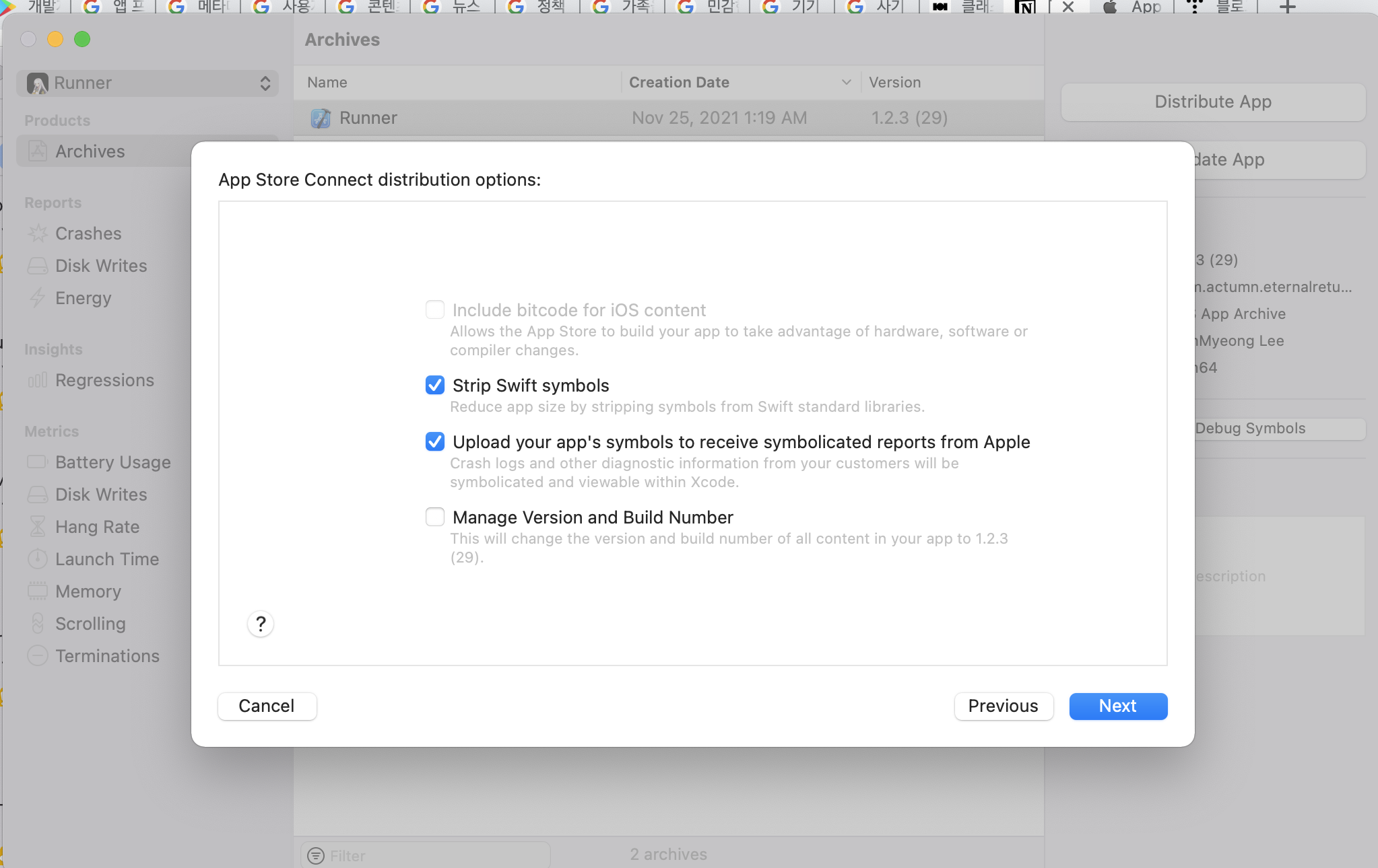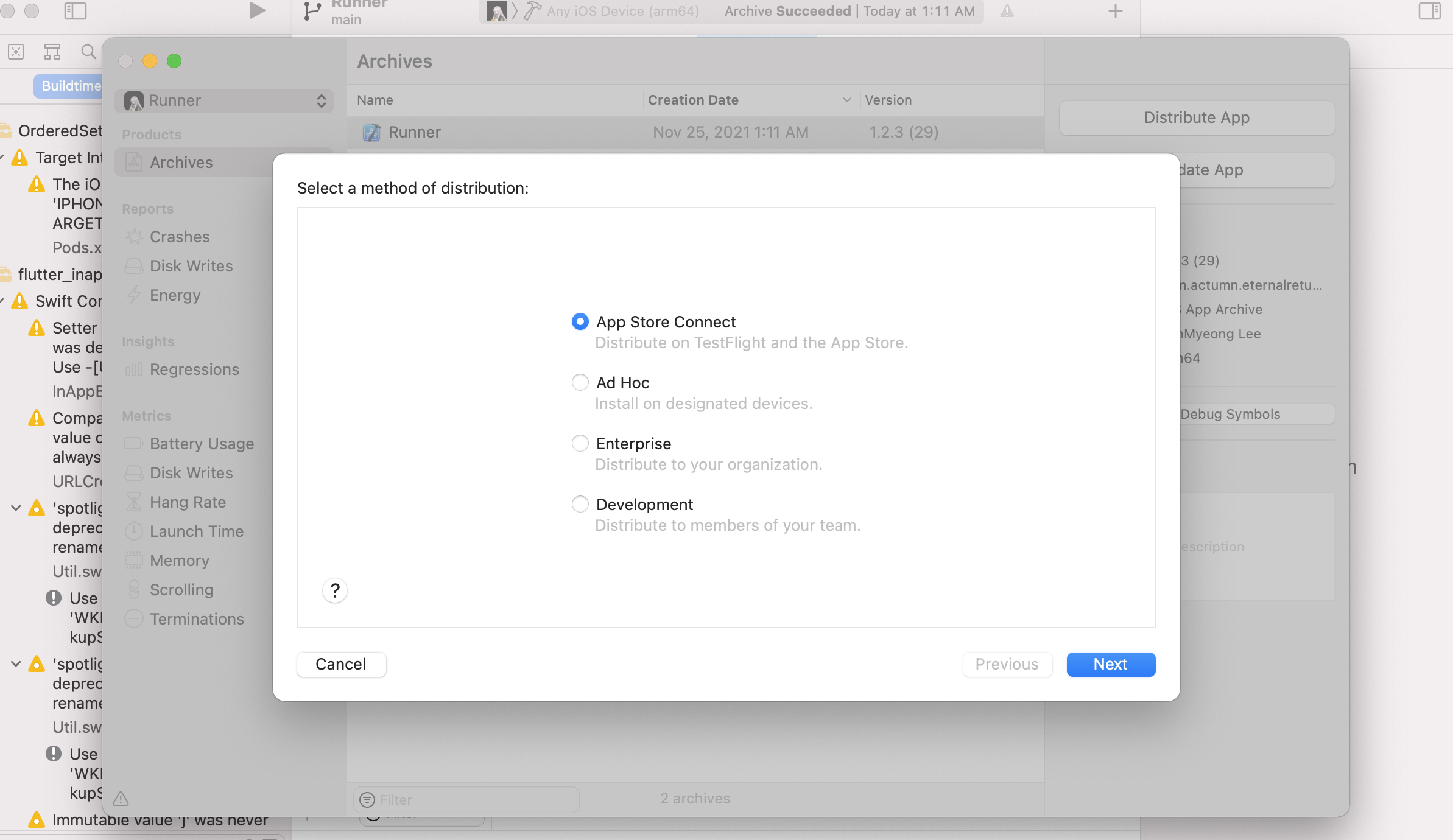 위와 같은 화면이 뜨는데, App Store Connect를 선택하고 [Next]
