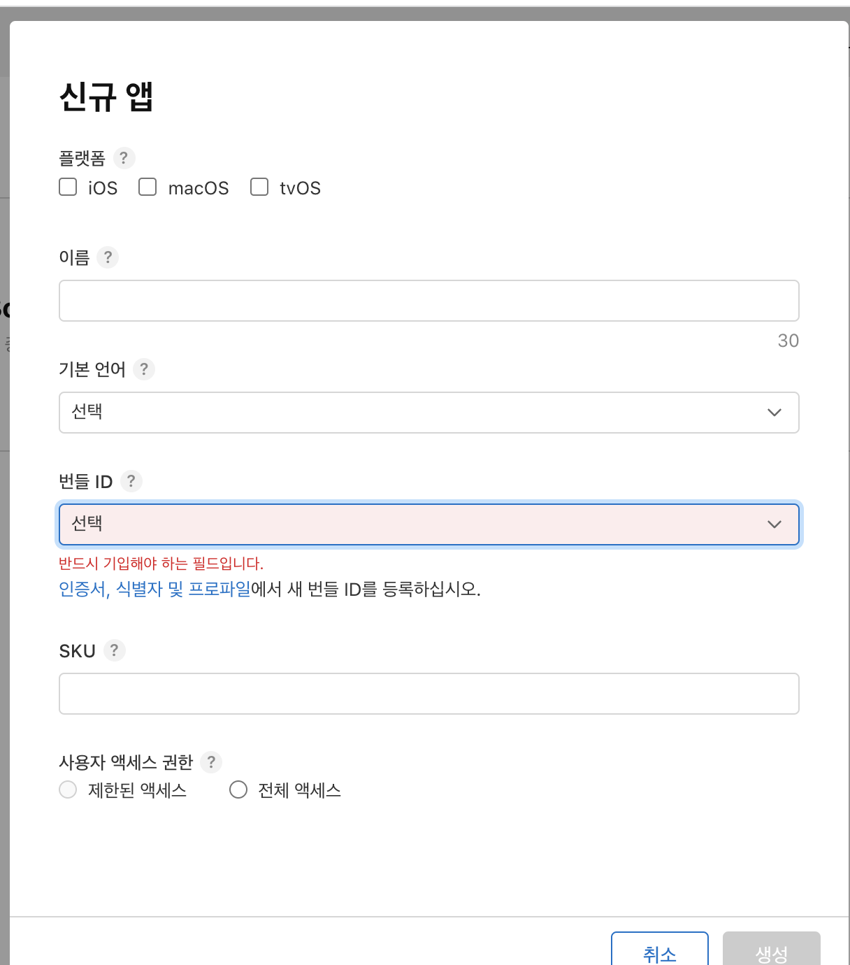 이름은 적당히 입력하면 되고, 번들 ID는 아까 만든 Identifier로 설정할 수 있다.