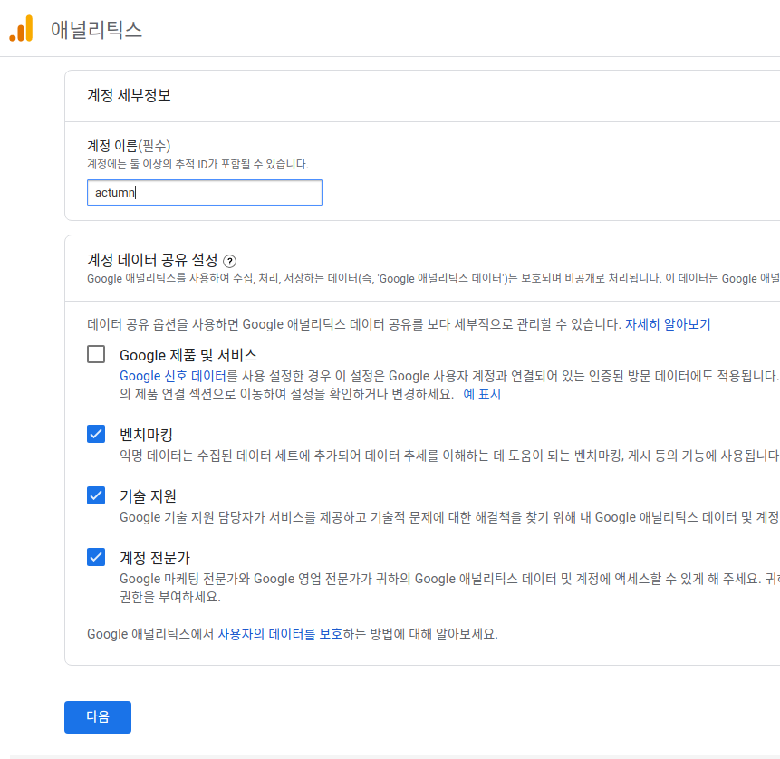 위 화면에서 구글 애널리틱스 계정을 생성할 수 있습니다.