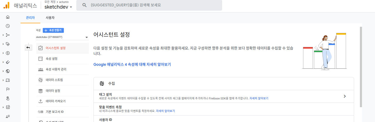 구글 애널리틱스 속성을 선택했다면 그 다음은 어시스턴트 설정 > 태그 설치를 차례로 클릭합니다.