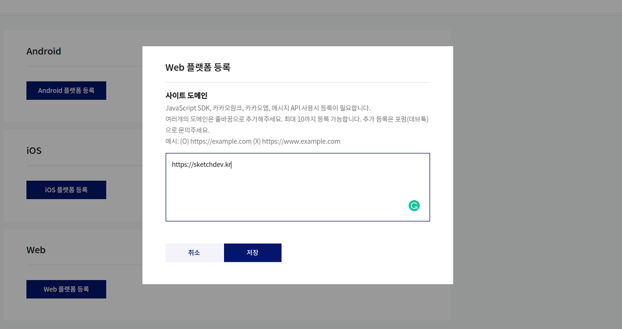 도메인을 입력하라고 뜨네요. 입력하고 저장합니다.