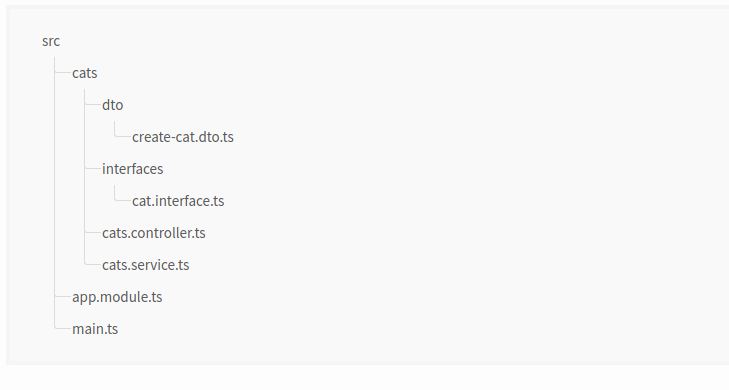 cats라는 도메인 아래 controller, service, dto, interface 등.